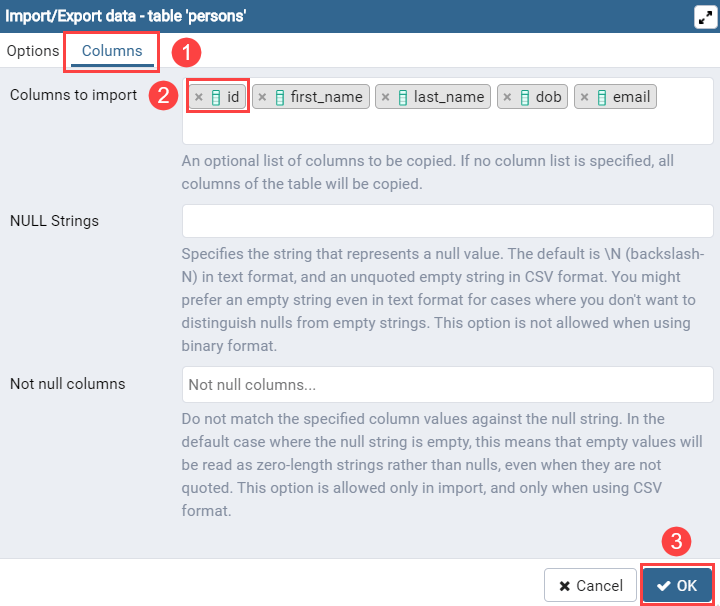 Third, click the columns tab, uncheck the id column, and click the OK button: